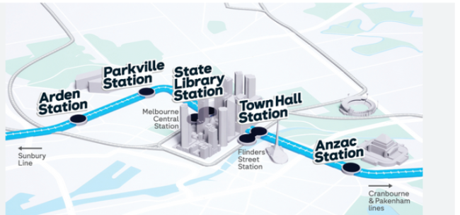 (在市区的两个站,乘客换乘City Loop和Metro Tunnel线路时无需重新刷卡)