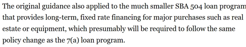 不仅如此,指导方针还适用于规模较小的SBA 504 贷款项目(通常也称CDC贷款),该项目提供用于购买房地产或设备等重大支出的长期固定利率融资。预计504贷款也将会遵循与7(a)贷款相同的新政策。