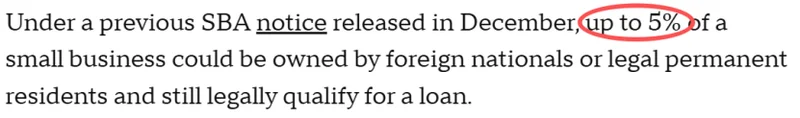 此前,SBA在去年12月发布的政策允许申请7(a)贷款的企业中,最多5%的股权可以由外国公民、绿卡持有者或居住在海外的美国国民或公民持有。(已废除)