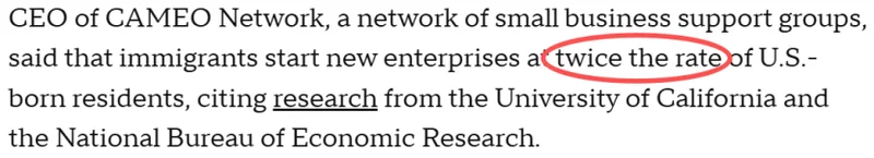 全国小企业支持组织协会(CAMEO Network)首席执行官卡罗莱娜·马丁内斯(Carolina Martinez)表示,根据加州大学和美国国家经济研究局的研究,移民创办新企业的速度是美国本土居民的两倍。