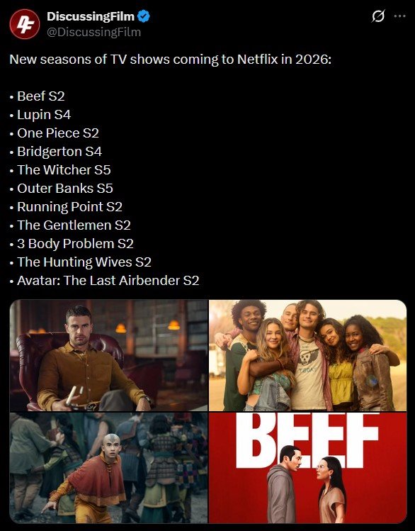 目前已确认档期的网飞剧集有:《布里奇顿》第四季(分为上下两部分,1月29/2月26),《暗夜情报员》第三季(2月19),真人版《海贼王》第二季(3月10),《怒呛人生》第二季(4月16)。