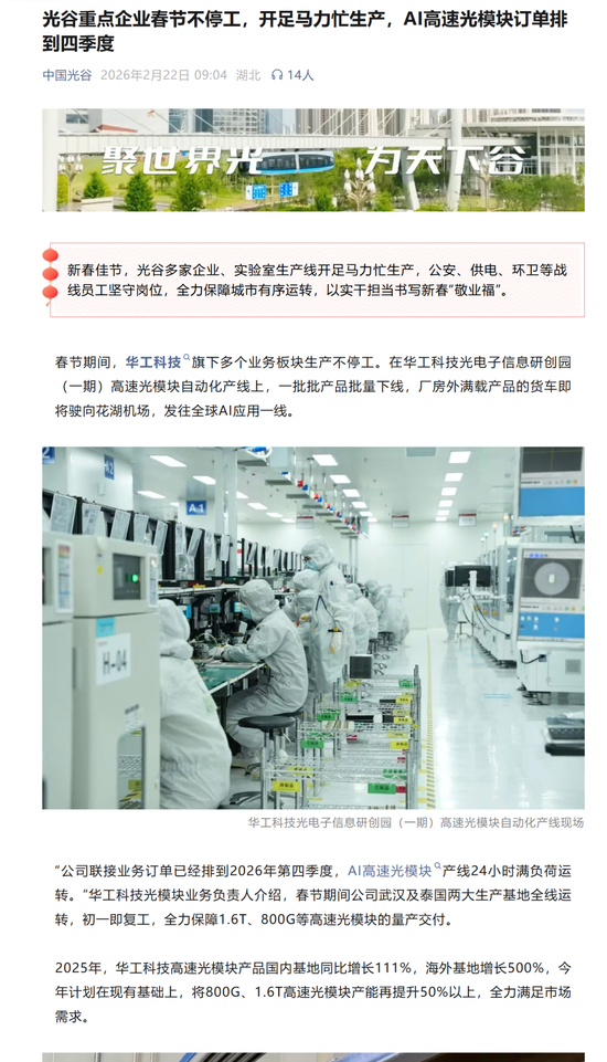 生产状态:AI高速光模块产线24小时满负荷运转,春节无休