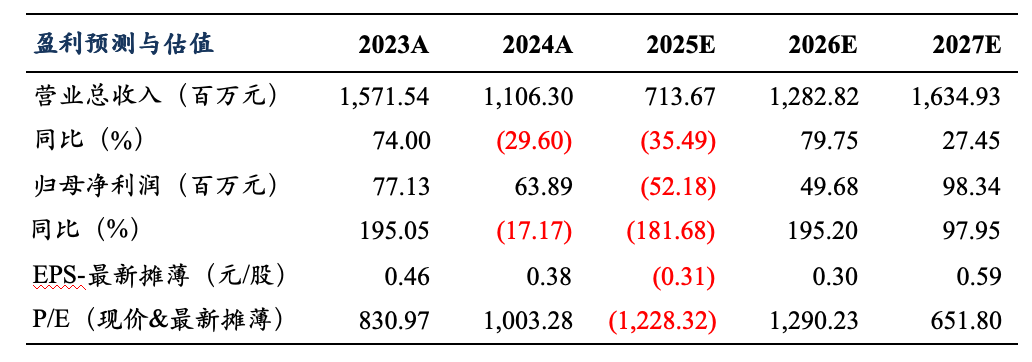 考虑到公司光伏主业承压,我们下调公司25-27年归母净利润为-0.5/0.5/1亿元(原值1.3/1.9/2.4亿元),当前市值对应PE为-1228/1290/652倍,考虑到公司业务成长性,维持“增持”评级。