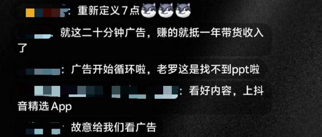 有网友称,在罗永浩迟到期间,会场上循环播放了十几遍广告,包含理想汽车、瑞幸咖啡等品牌。过多的广告引得直播间观众吐槽称:“就这二十分钟广告,赚的就抵一年带货收入了。”