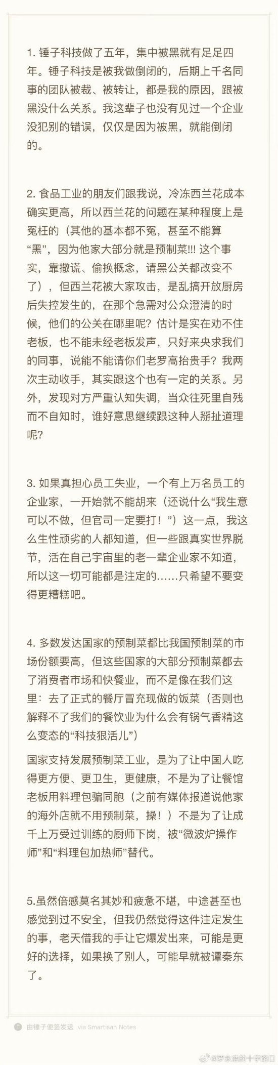 他表示,“锤子科技做了五年,集中被黑就有足足四年。锤子科技是被我做倒闭的,后期上千名同事的团队被裁、被转让,都是我的原因,跟被黑没什么关系。我这辈子也没有见过一个企业没犯别的错误,仅仅是因为被黑,就能倒闭的。”
