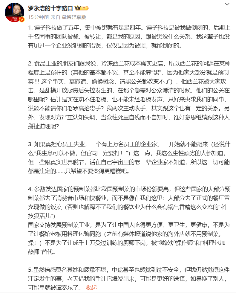 2、食品工业的朋友们跟我说,冷冻西兰花成本确实更高,所以西兰花的问题在某种程度上是冤枉的(其他的基本都不冤,甚至不能算“黑”,因为他家大部分就是预制菜!!! 这个事实,靠撒谎、偷换概念,请黑公关都改变不了),但西兰花被大家攻击,是乱搞开放厨房后失控发生的,在那个急需对公众澄清的时候,他们的公关在哪里呢?估计是实在劝不住老板,也不能未经老板发声,只好来央求我们的同事,说能不能请你们老罗高抬贵手?我两次主动收手,其实跟这个也有一定的关系。另外,发现对方严重认知失调,当众往死里自残而不自知时,谁好意思继续跟这种人掰扯道理呢?