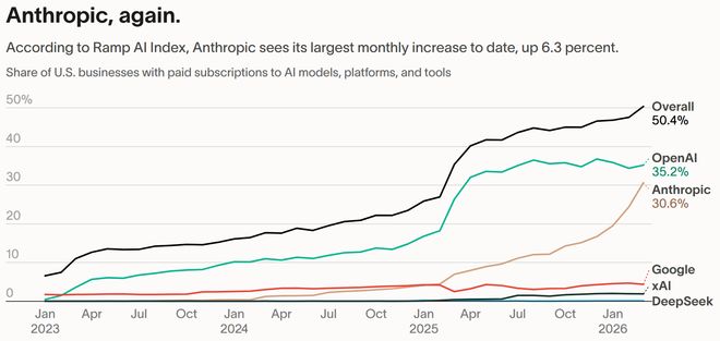 ▲美国企业中订阅不同公司AI的比例(图源:Ramp)
