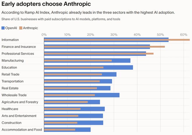 从行业维度看,Anthropic已在信息业、金融保险业和专业服务业三个AI采用率最高的行业中取得领先。
