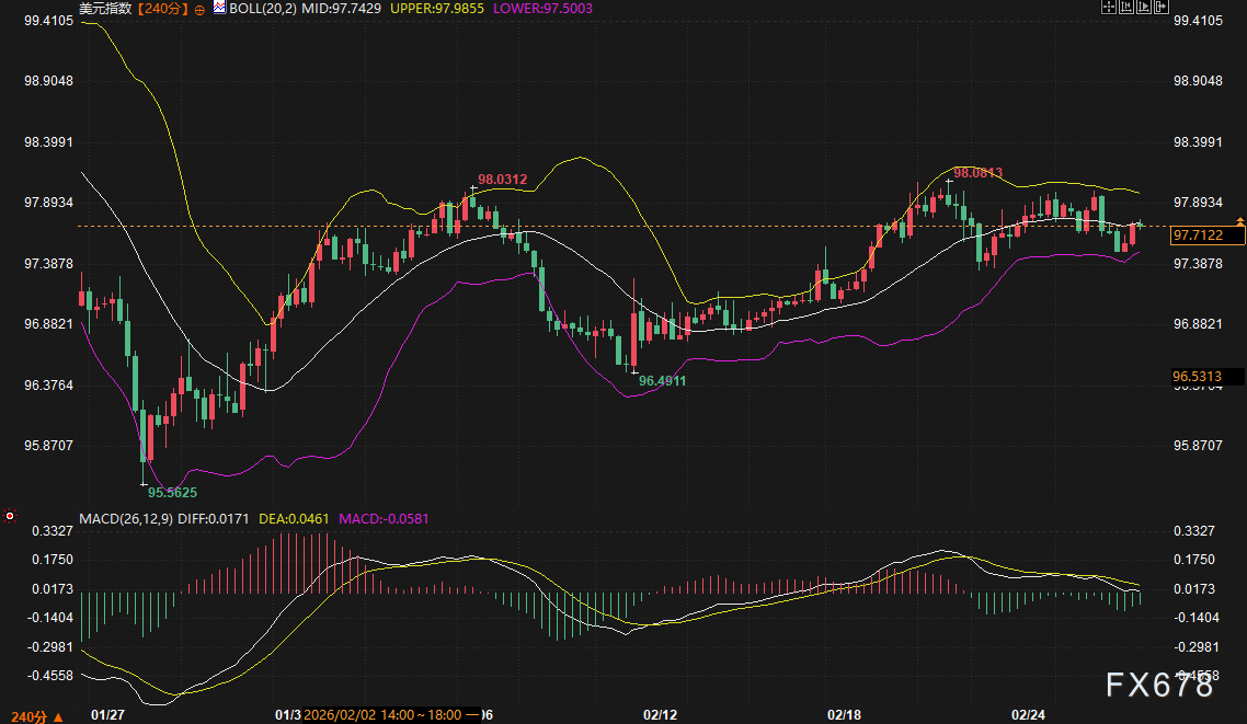 从技术面观察美元指数的240分钟K线结构,当前价格(97.7088)运行于布林带中轨(97.7427)下方,显示短期动能偏弱。值得注意的是,布林带在经历前期收窄后再度扩张,上轨指向97.9855、下轨延伸至97.5000,这通常预示着波动率将显著回升。MACD指标方面,DIFF(0.0168)与DEA(0.0461)仍处于死叉状态,但负值柱状体已连续缩短,表明空头杀跌动能正在衰竭,市场短期或陷入方向抉择。