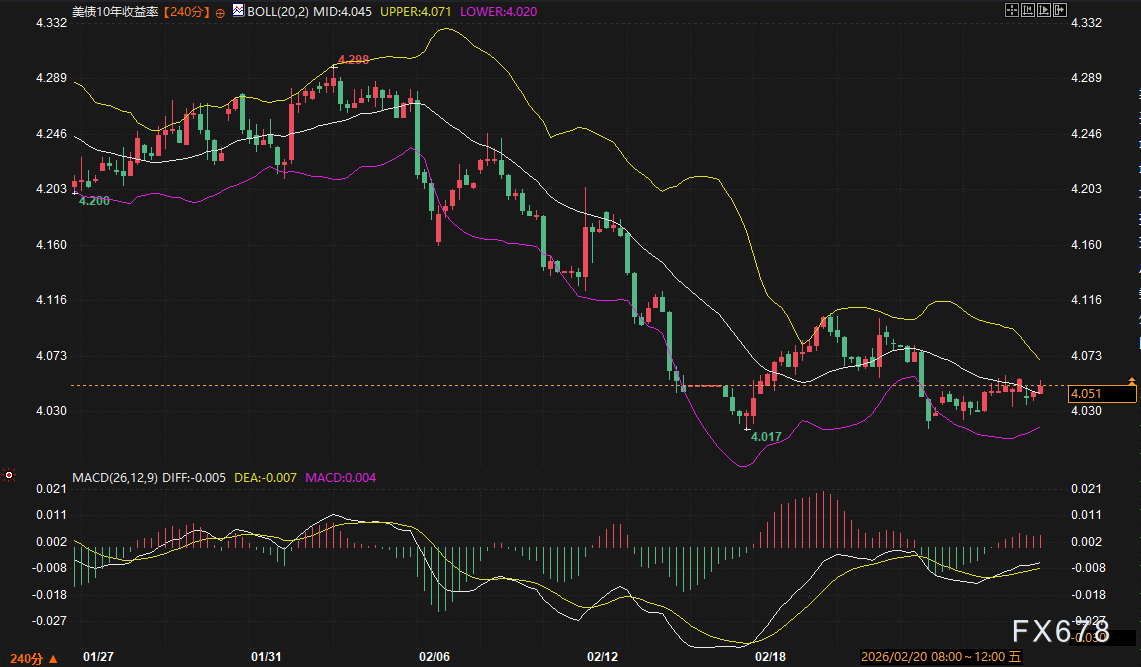 汇通财经APP讯——周四(2月26日),全球金融市场延续了近期的谨慎基调。尽管美元指数在上一交易日小幅反弹,但未能扭转本周以来的承压态势;现货黄金则持稳于历史高位下方的震荡区间,显示出多空力量的微妙平衡。与此同时,美国国债收益率曲线整体下移,10年期美债收益率逼近4.04%的关键技术水平,成为驱动当前市场定价的核心变量。本文将从美债收益率变动对美元的影响,以及债市避险情绪向黄金市场的传导机制两个差异化视角,对未来2-3个交易日的市场走势进行推演。