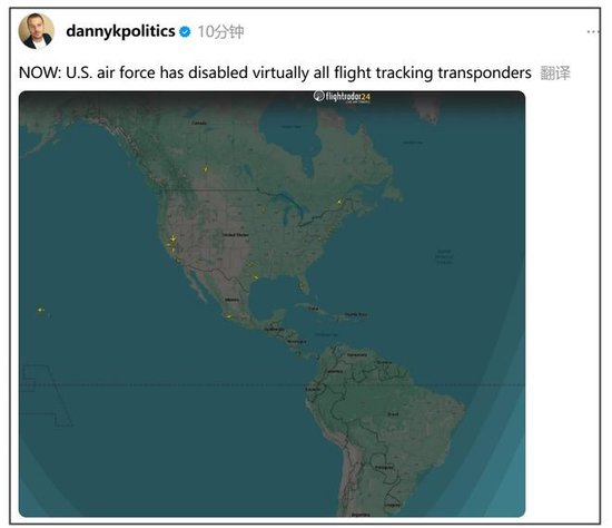 社交媒体消息显示,根据实时航班追踪器FlightRadar24信息,整个美国空军几乎关闭了所有飞行跟踪应答器。