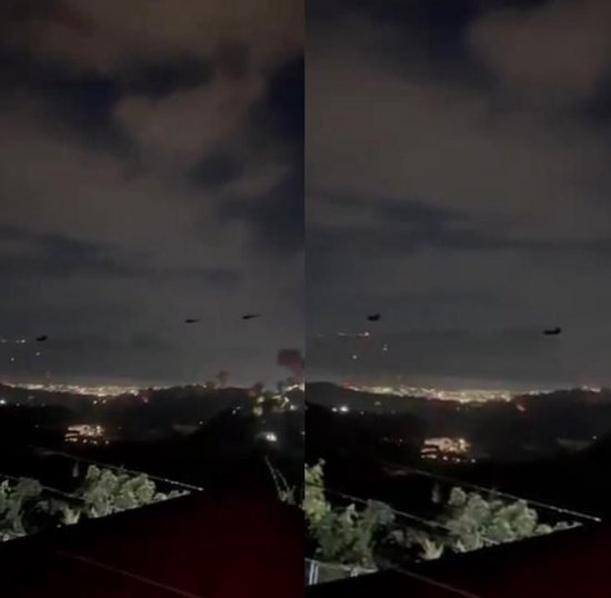 社交媒体上,拍摄于当地的视频显示,数十架疑似美军直升机盘旋于加拉加斯上空。
