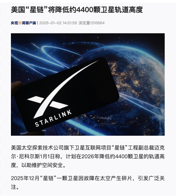业界有观点认为,“星链”大量卫星在太空带来安全挑战。据媒体报道,2025年12月,一颗“星链”卫星出现故障,轨道高度迅速下降4000米并产生碎片,说明有可能发生了爆炸。此类事故严重威胁其他航天器安全。