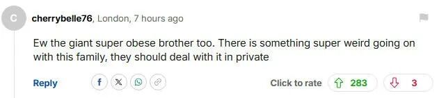 “额,她还有个超级肥胖的巨型兄弟。这个家肯定发生了一些奇怪的事,他们应该摆脱关注,私下处理。”