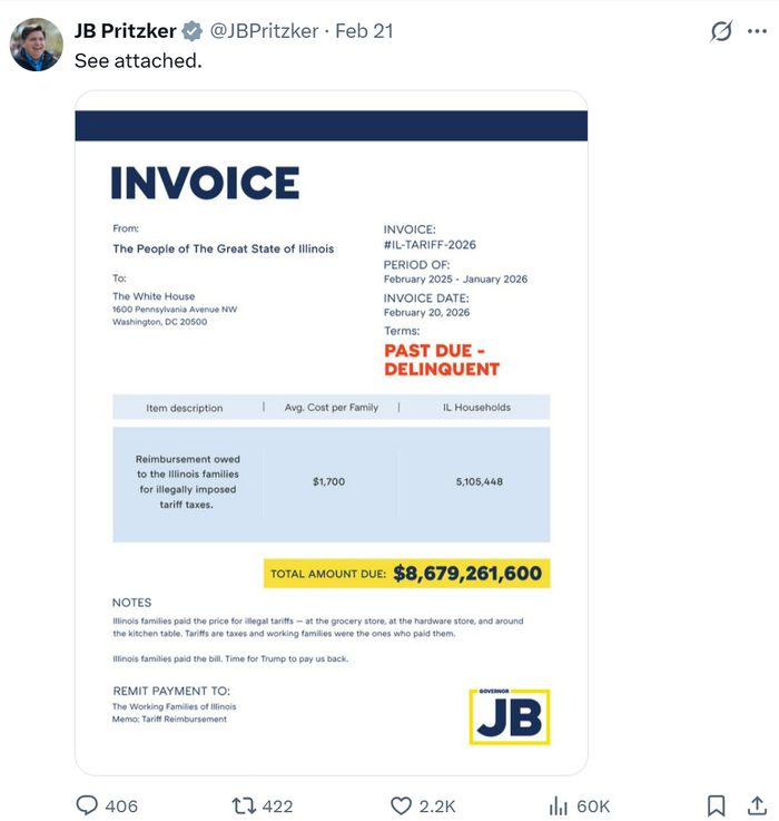 普里茨克还附上了一张金额相同的发票账单,账单上标记着“逾期未付”,收件人是白宫。普里茨克在配文中喊话特朗普:“付账单。”