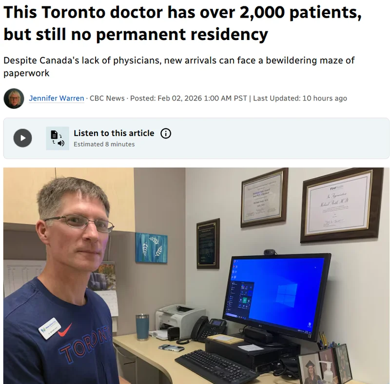 来自美国北卡罗来纳州的医生迈克尔·安蒂尔(Dr. Michael Antil)自 2023 年 7 月搬到多伦多,带着家人寻求更包容、多元的生活环境,并希望在加拿大的全民医疗体系中执业。然而,三年过去了,尽管加拿大面临严重的医生短缺,他仍未获得永久居民身份。