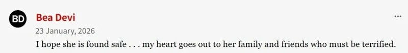 “希望她能平安获救……我为她的家人和朋友感到难过,他们一定非常害怕。”