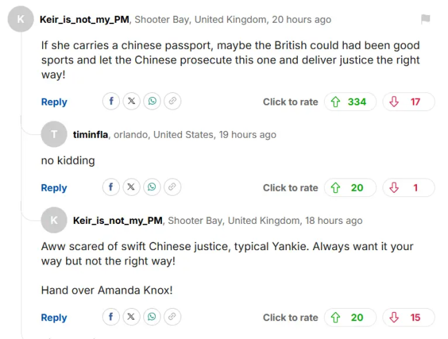 “如果她拿的是中国护照,也许英国人该大度点,把他交给中国处理——那才叫真正的正义!”