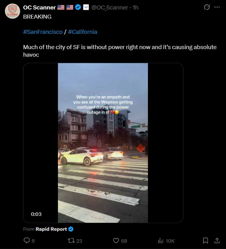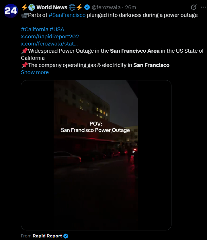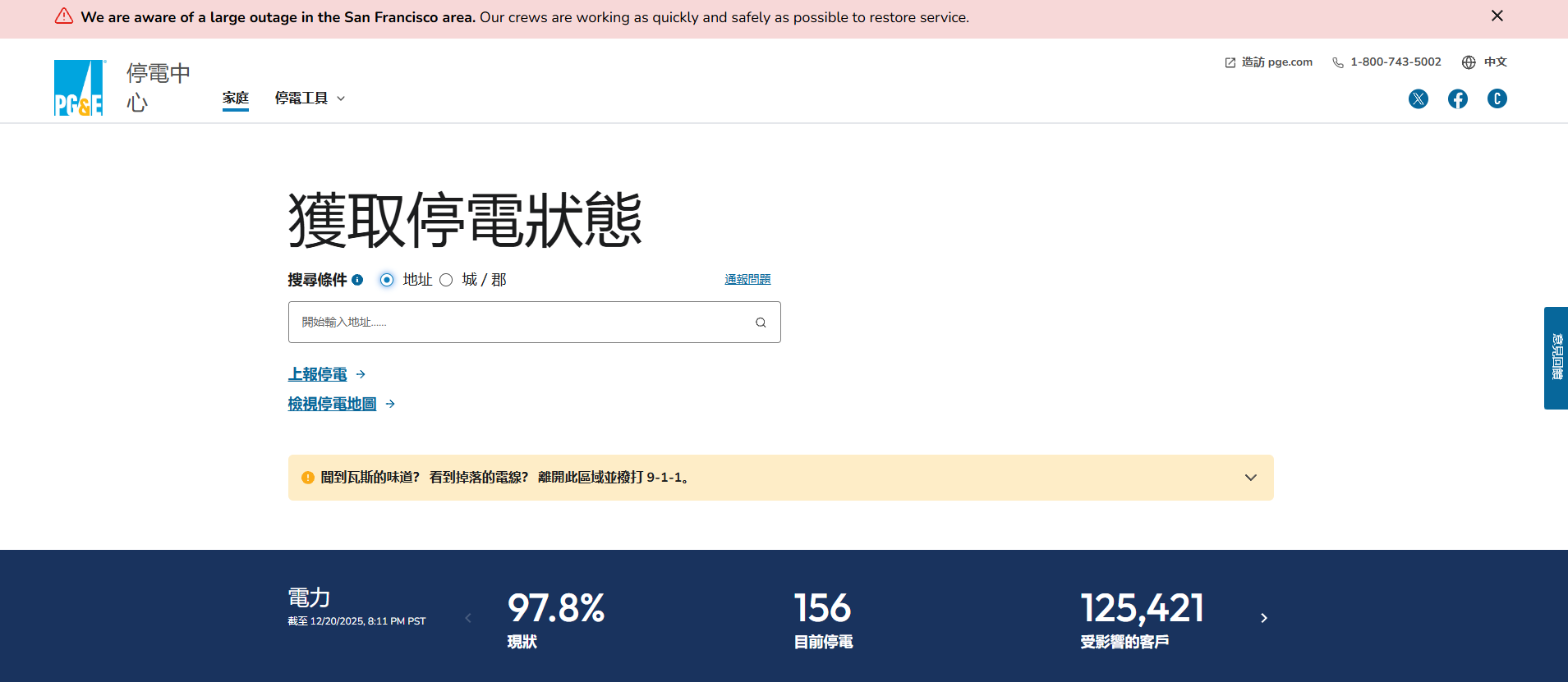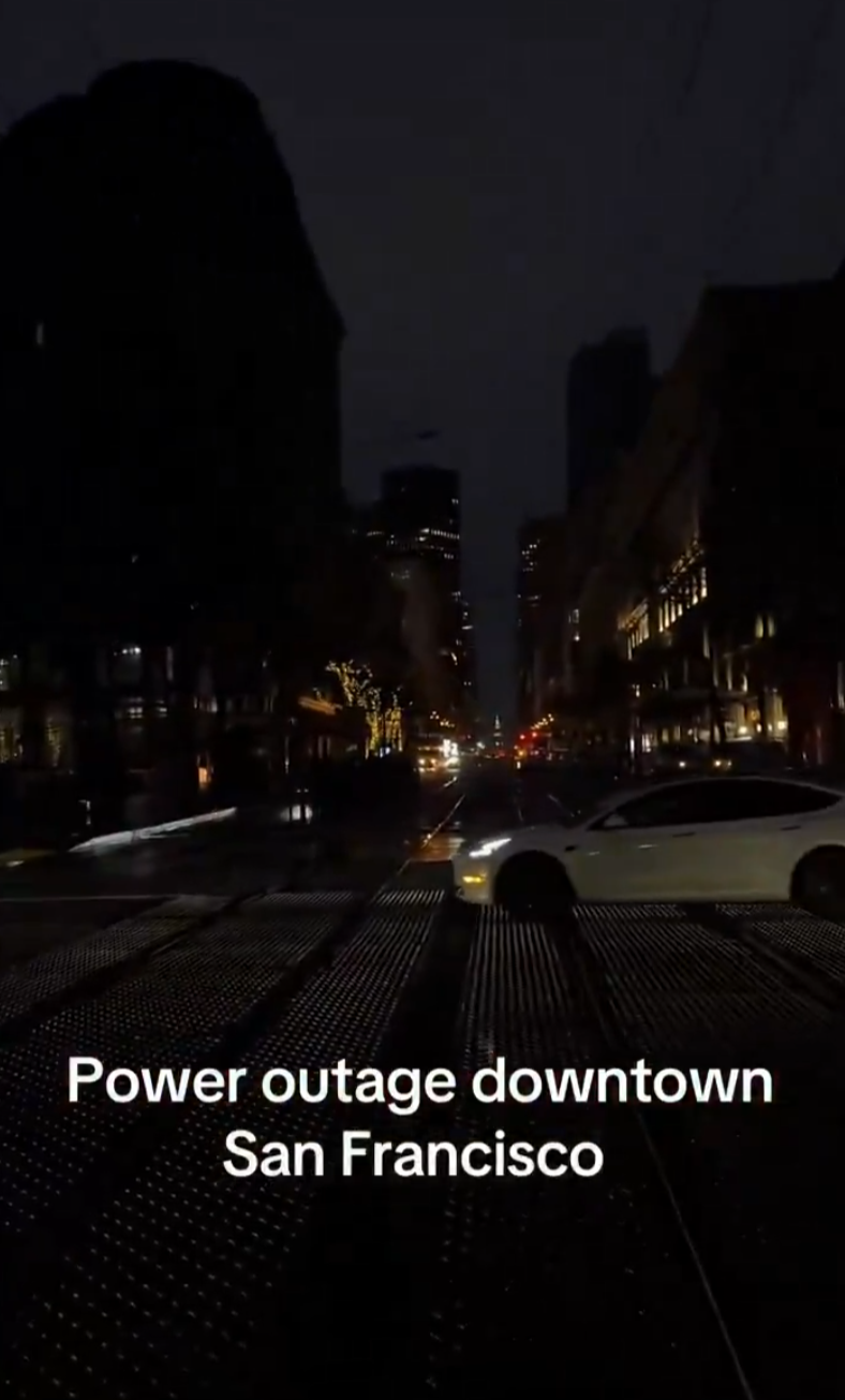 美国旧金山大规模停电 超12万人受影响 交通瘫痪 Source 日前,美国加利福尼亚州旧金山市20日遭遇大范围停电,约12.5万名居民受到影响,交通陷入瘫痪旧金山市应急管理部门发布提示,呼吁居民仅在生命安全紧急情况下拨打911。 同时避免非必要出行,将失灵的交通信号灯视为四向停靠,并尽量关闭大型电器,保持冰箱和冷冻柜门关闭,以防电力恢复时出现电涌风险。 报道称,当日正值圣诞节前购物和社交高峰期,旧金山市众多商家被迫停业。 目前,大部分区域停电原因暂不明确。 据旧金山消防局消息,太平洋天然气和电力公司位于该市的一处变电站内部当天下午发生火灾,引发部分停电。