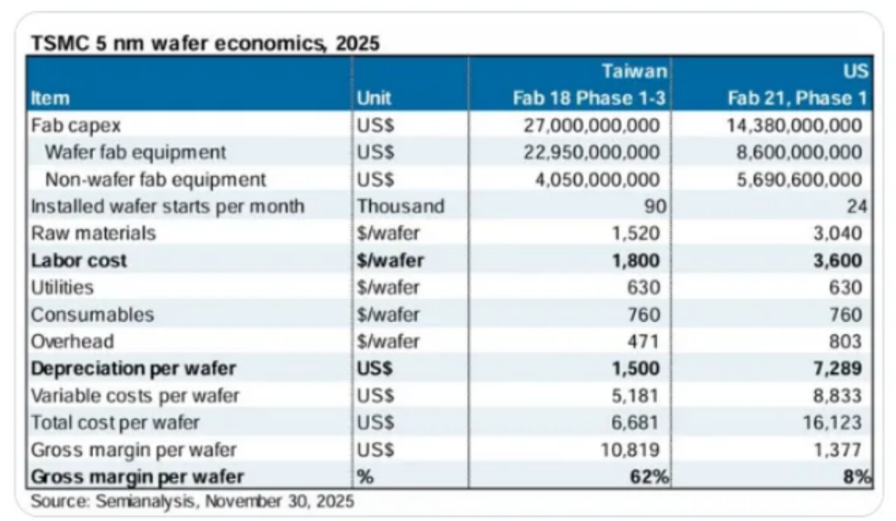 SemiAnalysis最近的分析显示,美国5nm工厂的12英寸晶圆最终成本达到了1.6万美元,而台积电本土工厂只要6681美元,两边的毛利润分别是1377、10819美元,导致美国工厂的毛利率从本土的62%直接跌到了8%。