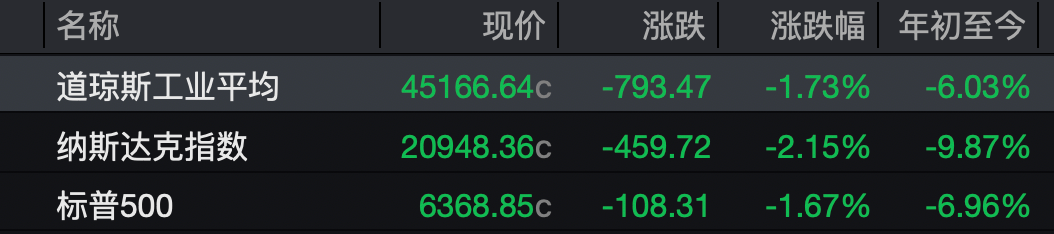 截至3月27日收盘,道指跌1.73%,重挫近800点,报45166.64点,本周累跌0.9%;标普500指数跌1.67%,报6368.85点,本周累跌2.12%;纳指跌2.15%,报20948.36点,本周累跌3.23%。