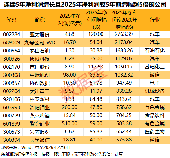 从2025年净利润较5年前的变动幅度来看,49家公司净利润实现翻倍,14家公司净利润增长超5倍,6家增长幅度超过10倍,包括亚太股份、九号公司-WD、泰山石油、博俊科技、芭田股份、中际旭创。
