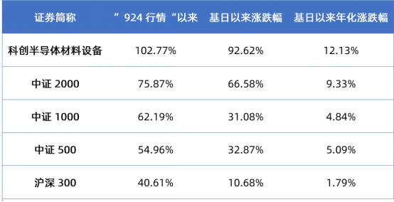 指数具备20CM涨停板优势,更快捕捉大涨行情弹性。科创半导体材料设备指数自2024年9月24日以来至2025年11月26日,累计上涨102.77%,拉长时间看来,自指数基日以来年化涨幅超12%,跑赢A股大中小盘指数。