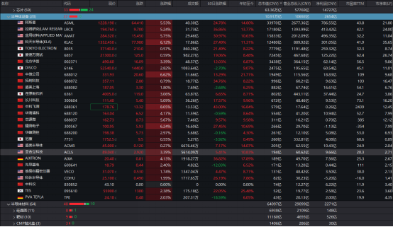 今天科创半导体、半导体材料等活跃,主要受益于海外市场半导体设备、材料公司的大幅上涨。开年以来2个交易日,全球主要半导体设备、材料厂商共振上涨,阿斯麦、拉姆研究、应用材料、科天等涨幅超过10%,反应出全球半导体设备行业的高景气度。高景气背后,是下游AI需求的持续旺盛。摩根大通指出,AI数据中心资本支出在2025年同比增长约65%,2026年预计至少增长50%,带动先进逻辑芯片、存储芯片(HBM及其它)以及先进封装技术等需求,为整个半导体价值链带来增量。