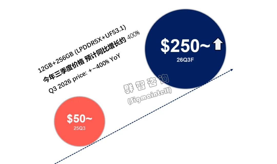 手机应用内存方面,以12GB+256GB内存组合为例,2025年第三季度的行业价格约为50美元,预计到今年第三季度,其价格将同比涨幅约4倍。伊朗战争等黑天鹅事件将使得上游供应存在极大不确定性。