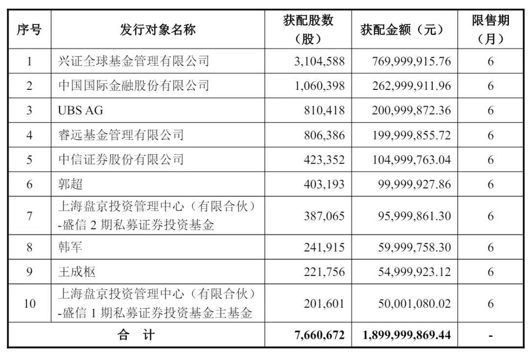 其中,兴证全球基金管理有限公司认购7.7亿,中国国际金融股份有限公司认购2.63亿,UBS AG认购2亿元,睿远基金管理有限公司认购2亿元,中信证券股份有限公司认购1.05亿元,郭超认购1亿元,上海盘京投资管理中心(有限合伙)-盛信 2 期私募证券投资基金认购9600万元,韩军认购6000万元,王成枢认购5500万元,上海盘京投资管理中心(有限合伙)-盛信 1 期私募证券投资基金主基金认购5000万元。