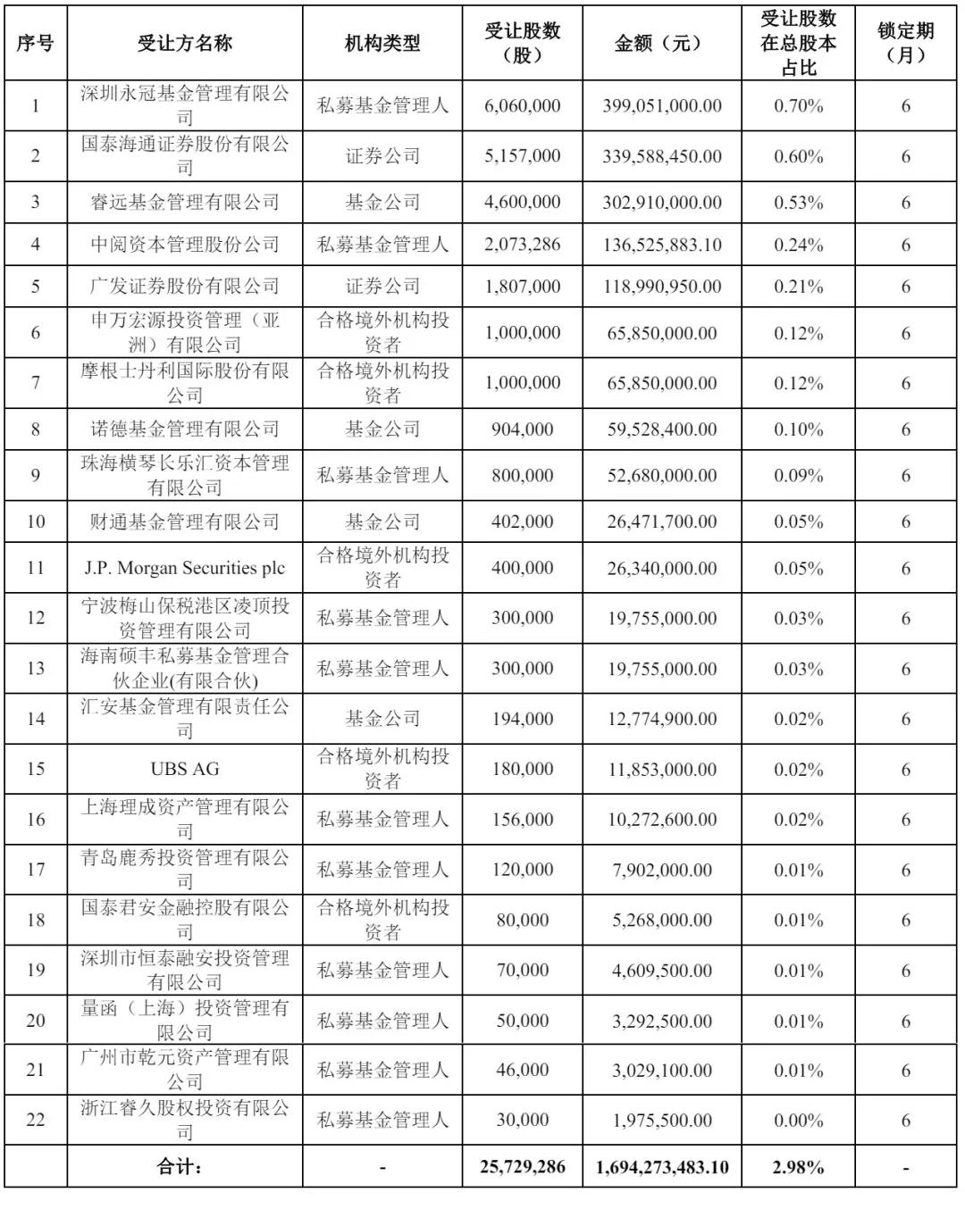 出让方询价转让股份数量为25,729,286股,占公司总股本的2.98%;询价转让的价格为65.85元/股,交易金额16.94亿元。