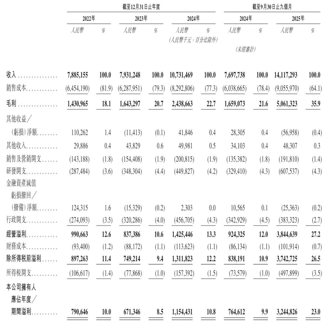 胜宏科技2025年前9个月营收为141.17亿元,较上年同期的77亿元增长83%;毛利为50.6亿元,经营利润为38.45亿元,期内利润为32.45亿元,期内利润率为23%。