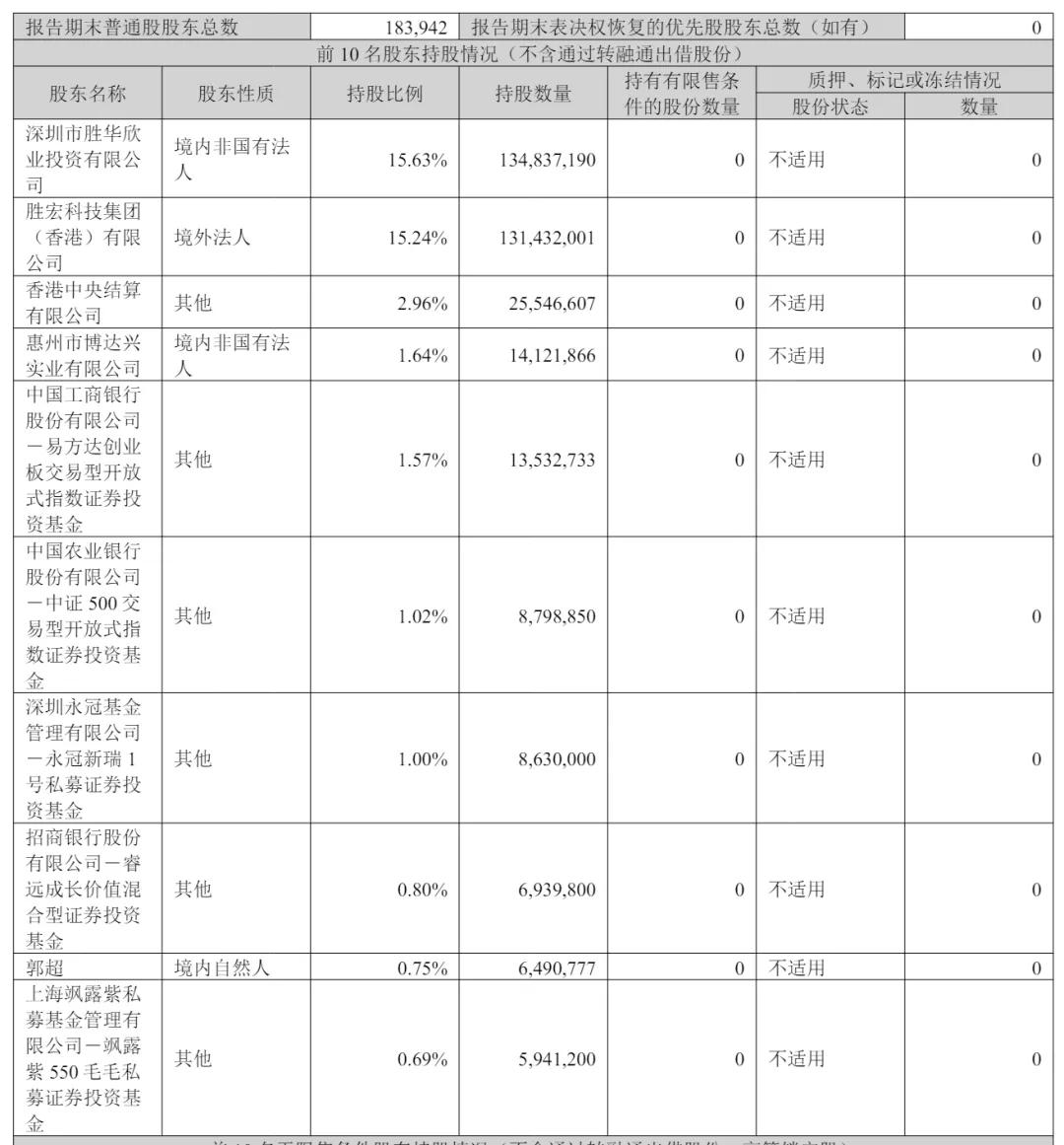 截至2025年9月30日,深圳市胜华欣业投资有限公司持股为15.63%,胜宏科技集团(香港)有限公司持股为15.24%,香港中央结算有限公司持股为2.96%,惠州市博达兴实业有限公司持股为1.64%,中国工商银行股份有限公司-易方达创业板交易型开放式指数证券投资基金持股为1.57%;