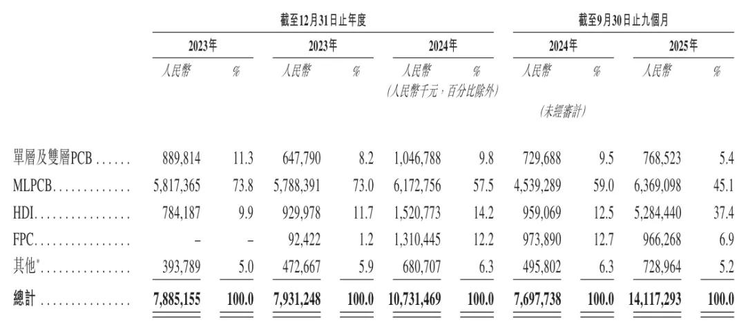 胜宏科技2025年前9个月来自单层及双层PCB收入为7.69亿元,占比为5.4%;来自MLPCB收入为63.69亿元,占比为45.1%;来自HDI的收入为52.84亿元,占比为37.4%;来自FPC收入为9.66亿元,占比为6.9%;来自其他收入为7.29亿元,占比为5.2%。
