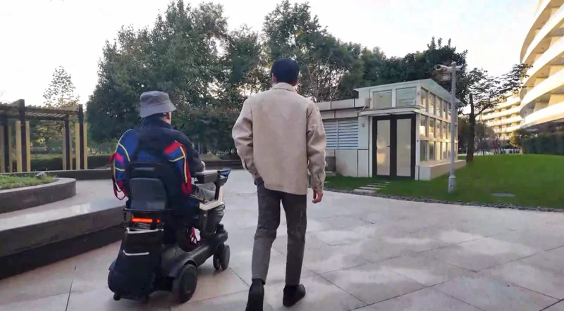2025年,四肢瘫痪患者(左)通过脑机接口系统“意念”控制轮椅。(中国科学院脑科学与智能技术卓越创新中心供图)