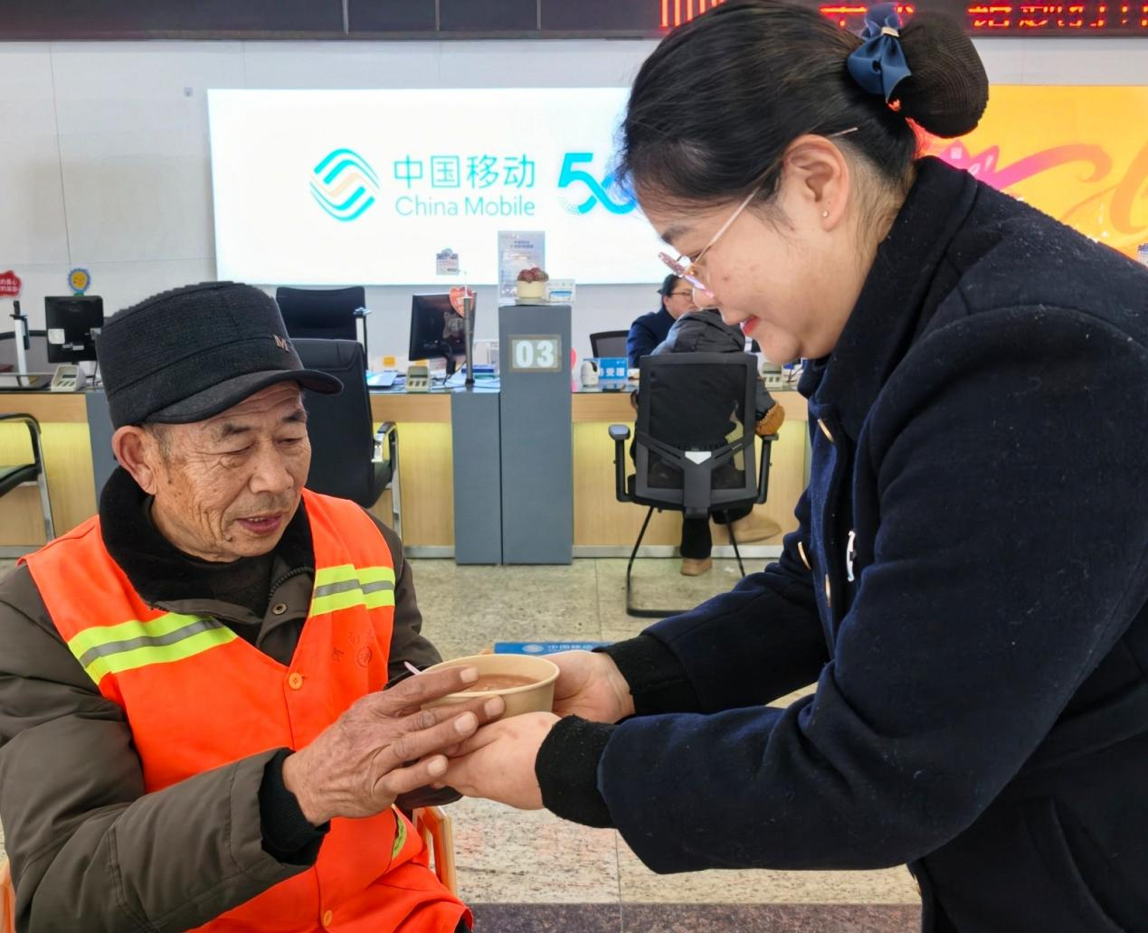 “这腊八粥太暖心了,喝着浑身都热乎,太感谢你们啦!”环卫工人李大爷端着腊八粥,脸上满是幸福。为弘扬传统文化,让寒冬中坚守岗位的环卫工人感受节日温暖,中国移动江苏公司连云港分公司(以下简称“连云港移动”)迅速行动,在服务厅设立爱心服务点,开展温馨的腊八节送温暖活动。