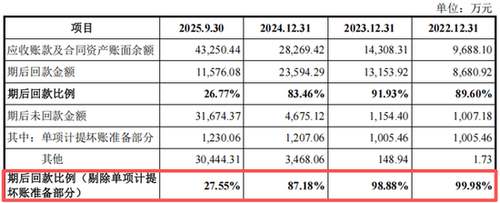 招股书及问询回复显示,公司的应收账款规模随着营收膨胀而同步飙升。更值得警惕的是,反映回款健康度的关键指标——应收账款期后回款率,出现了灾难性下滑。据公司披露,该比率已从2024年末的87.18% 骤降至2025年第三季度末的27.55%。这意味着,在2025年前三季度产生的应收账款中,有超过三分之二在期后未能按时收回,期末悬而未决的应收款高达3.17亿元。与此同时,逾期应收账款的比例和金额也在持续攀升。