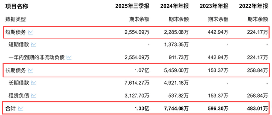 从上表可见,公司的有息债务总额在2024年呈现爆炸式增长,同比激增近12倍,至2025年第三季度末已突破1.3亿元。这与公司营收和利润的增长曲线形成了鲜明而反常的对比。