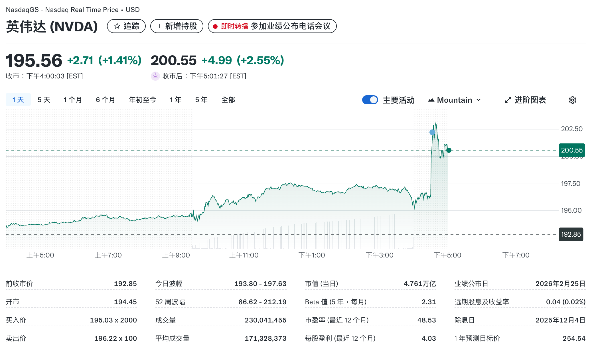 英伟达周三在纳斯达克交易所的开盘价为194.45美元。截至周三收盘,英伟达股价上涨2.71美元,报收于195.56美元,涨幅为1.41%。截至发稿,英伟达股价在盘后交易中上涨4.99美元至200.55美元,涨幅为2.55%。过去52周,英伟达股价最高为212.19美元,最低为86.62美元。