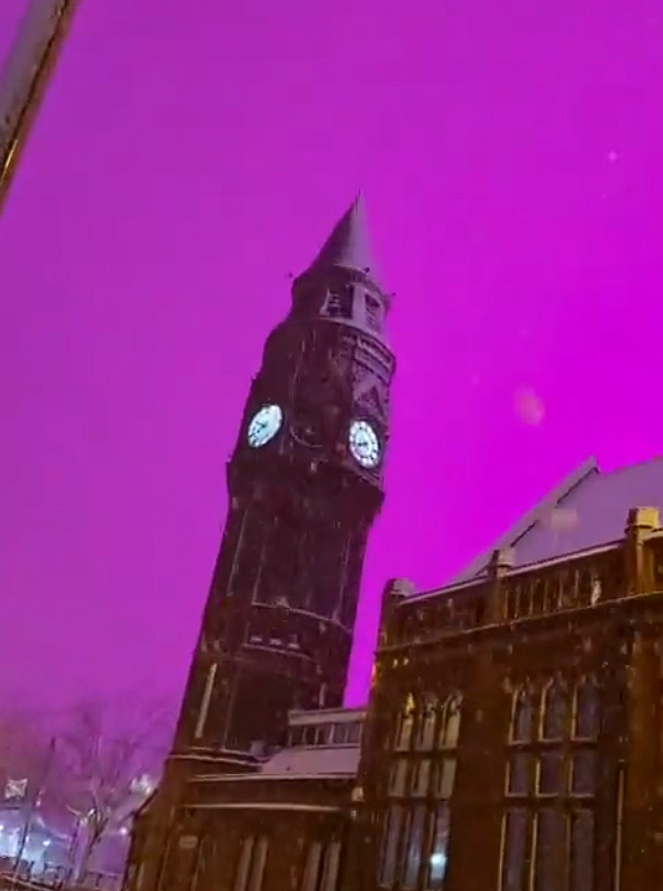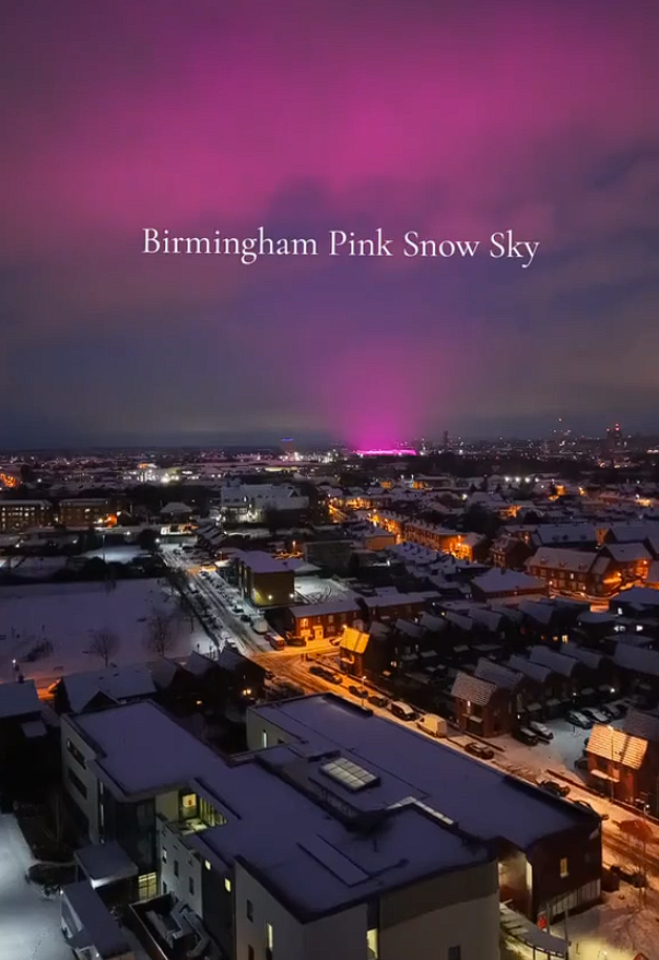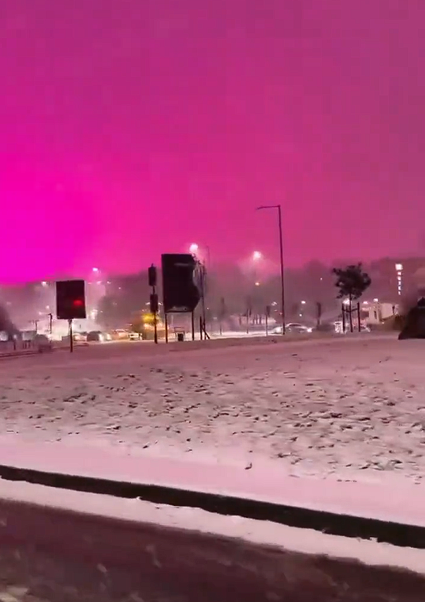 看到这样其他的场景后,许多人第一反应以为是罕见的“北极光”降临,然而,真相却更加有趣:这幕“天空大秀”的源头,其实是当地体育场常用的普通粉红色LED灯光。