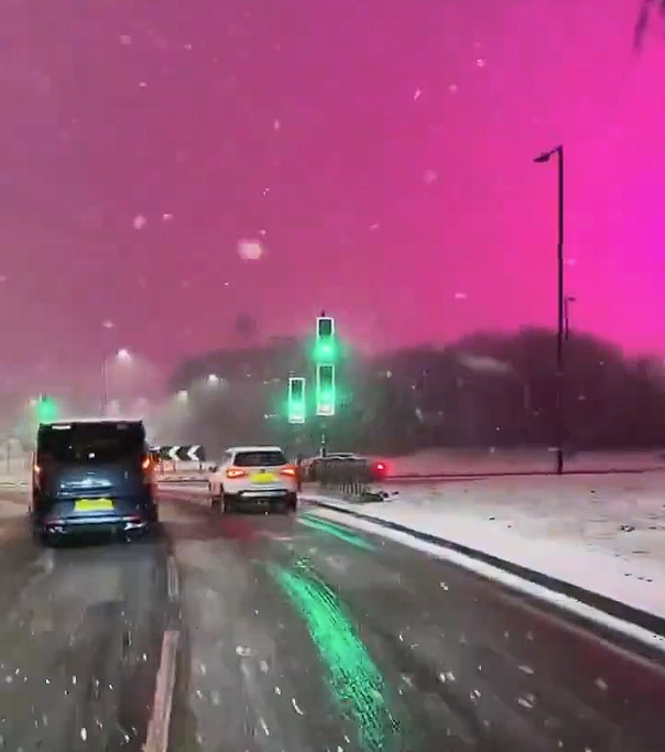 气象专家解释称,当时低空聚集的浓密雪云充满了雪花微粒,对蓝光等短波光线产生了强烈的散射作用,而红光、粉光等较长波长的色彩则得以穿透云层,主导了天空的色调。