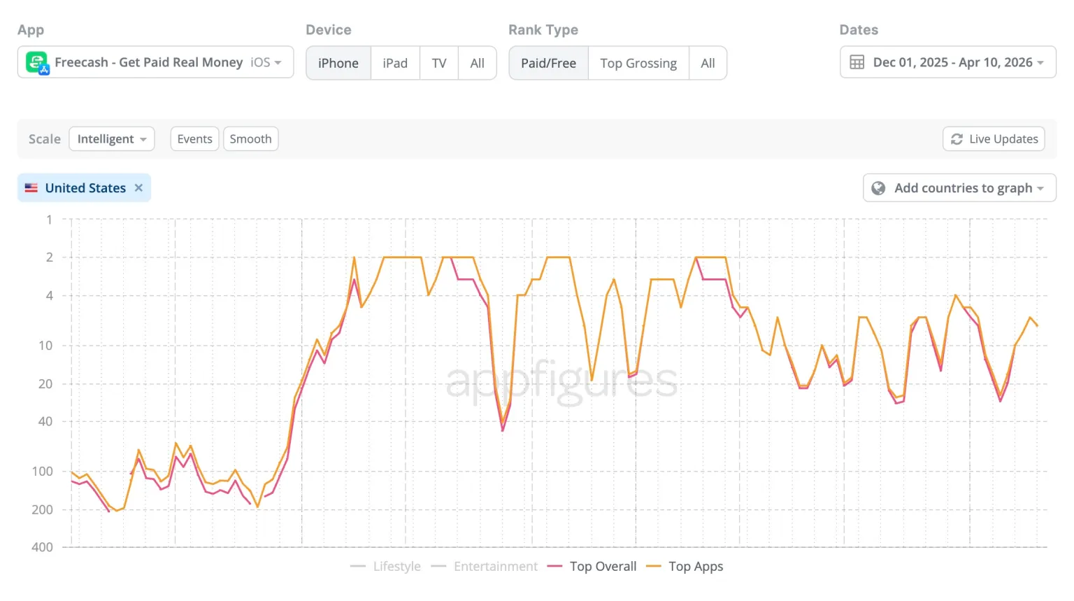 数据分析显示,仅在 2026 年 1 月,“Freecash”在苹果 App Store 和 Google Play 平台上的总下载量就达到 550 万次,且此后一直在 App Store 排行榜中保持较高排名。 除了通过夸大收益的 TikTok 广告吸引用户外,该应用似乎还利用机器人账号和虚假评分来推高热度和曝光度。 有迹象表明,开发团队曾通过收购已有的 App Store 应用,再将其更名为“Freecash”并更新为同样的功能,以规避 2024 年曾遭遇的一次下架封禁与后续的严格审核流程。