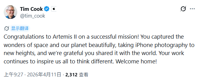 据悉,本次任务中,4名宇航员各携带一台iPhone 17 Pro Max进入深空,全程飞行模式、无网络连接,通过飞船系统回传影像。