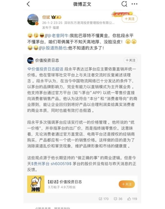对此知名网红私募董事长“股道热肠也”怒怼: “他不知道的太多了”。另一位博主总结道: 我批巴菲特不懂黄金,你批段永平不懂茅台,咱哥俩属于不知天高地厚了。此外,但斌则在一旁吃瓜看戏。