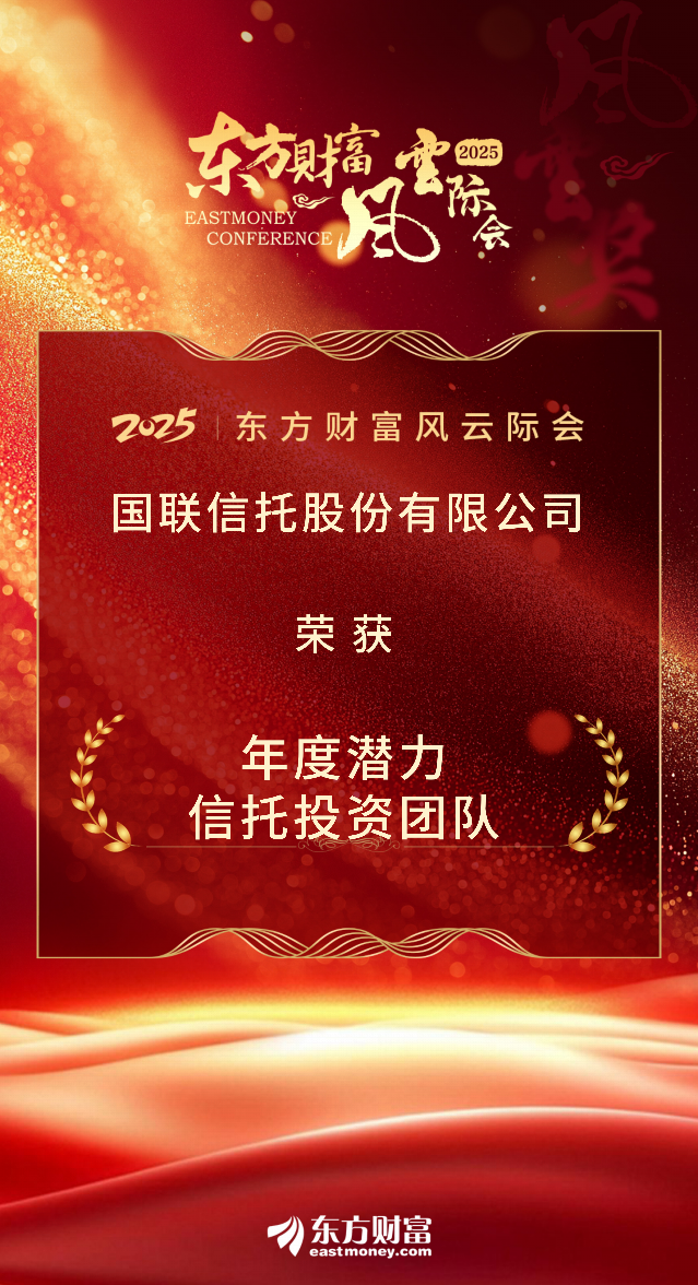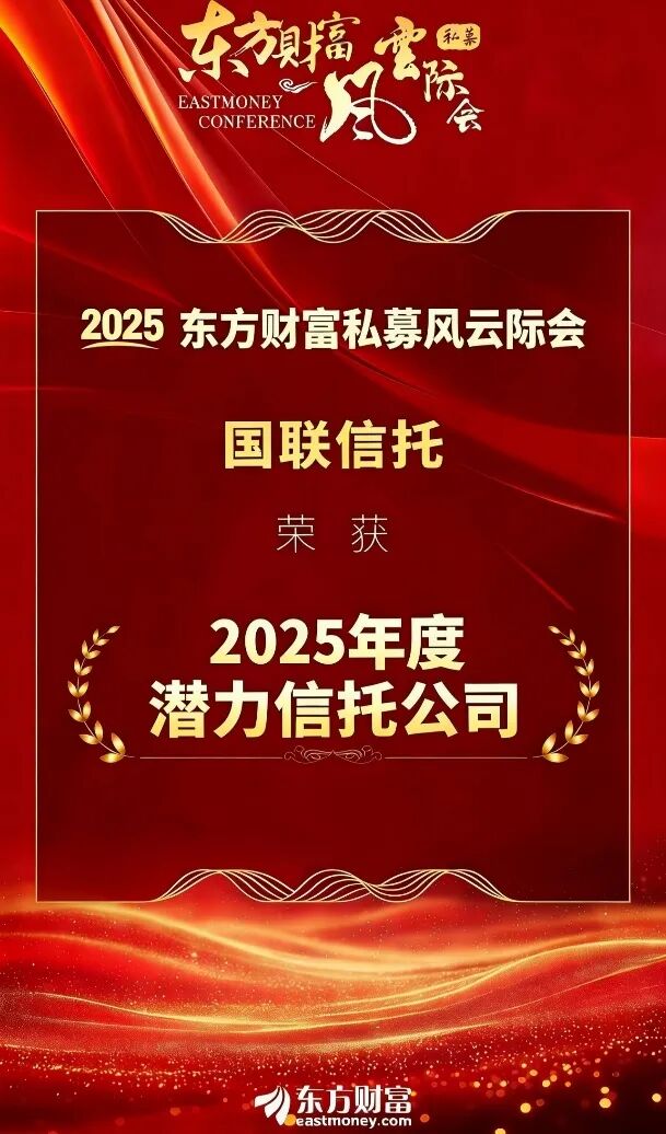 2025年12月5至6日,由东方财富主办的中国资产管理论坛暨东方财富风云际会、私募风云际会在贵阳举办。国联信托凭借转型成效与投研实力,荣获“2025年度潜力信托公司”“2025年度潜力信托投资团队”两大奖项,这是公司继2024年斩获“品牌价值信托公司”“信托投资团队风云奖”之后,再次在该权威评选中获得认可。