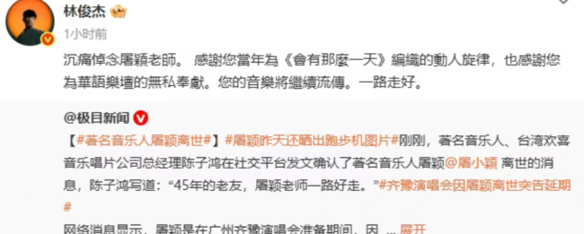 林俊杰在微博上感谢屠颖:“沉痛悼念屠颖老师。感谢您当年为《会有那么一天》编织的动人旋律,也感谢您为华语乐坛的无私奉献。您的音乐将永久流传。一路走好。”