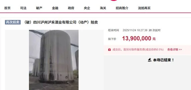 2025年11月24日,四川泸州泸禾酒业有限公司破产拍卖的一批白酒原酒共5549.55吨,最终以1390万元成交。