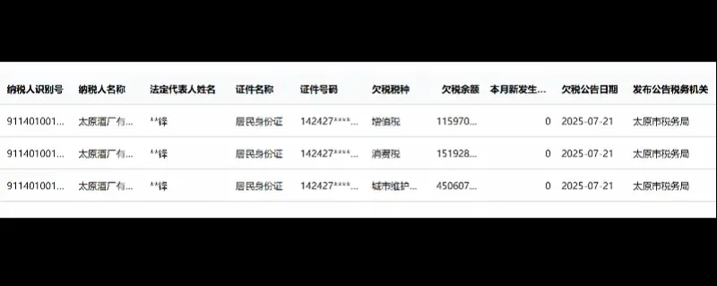 与纳税大户身份形成鲜明对比的,是去年的欠税。据南方都市报,去年7月,太原酒厂还曾因拖欠三种税款,合计312.96万元,被当地税务局列入欠税公告,彼时荣建峰正是其法人。