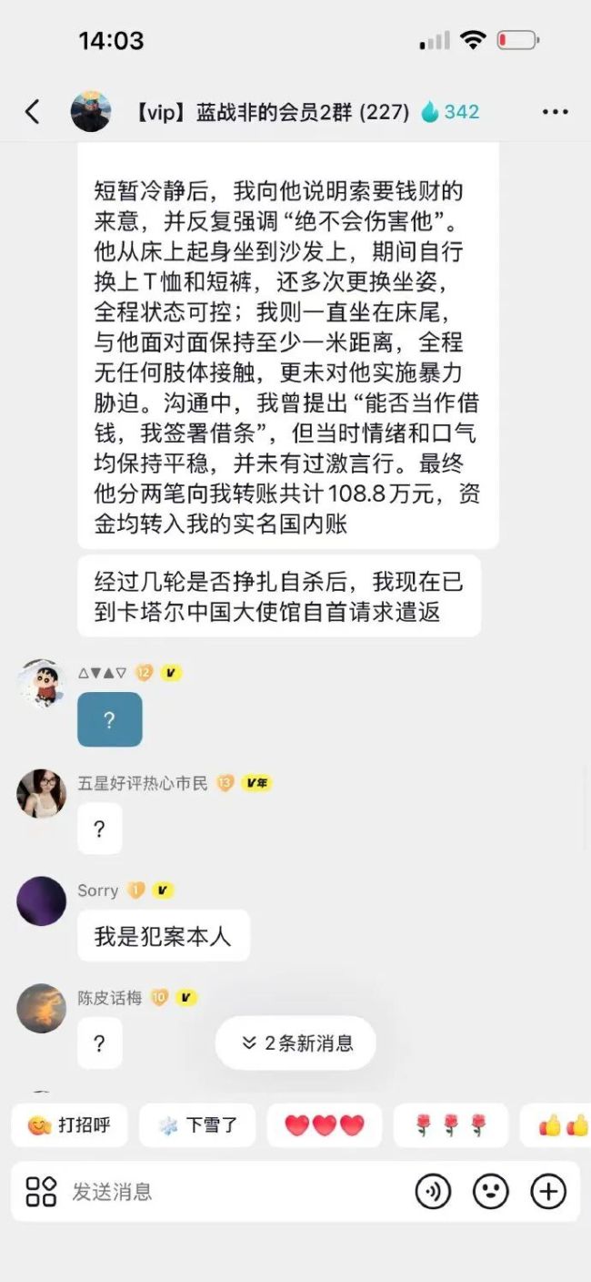 网传疑似蓝战非被绑事件的“作案人”在蓝战非的会员群内“自首”。自爆身份称炒股欠下巨债,并回应作案细节,还称他现在已经准备去卡塔尔中国大使馆自首,请求遣返回国。当事人在蓝战非的会员群内自爆。