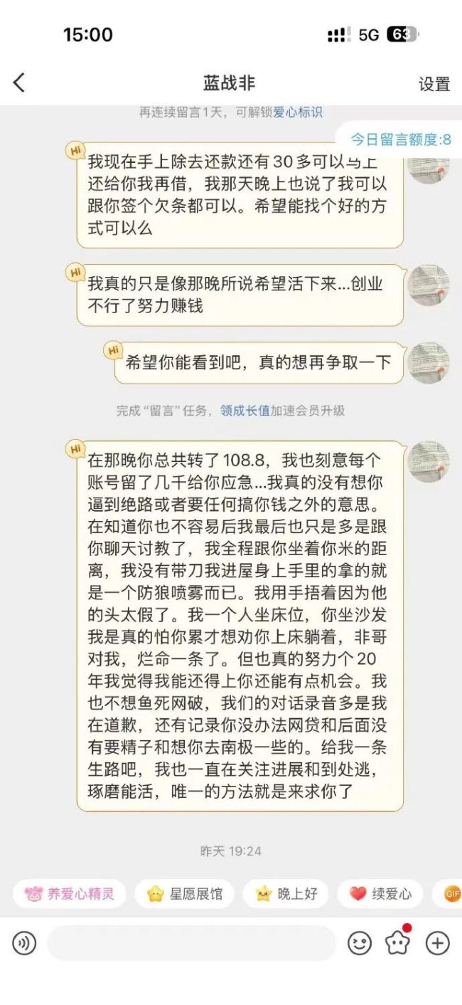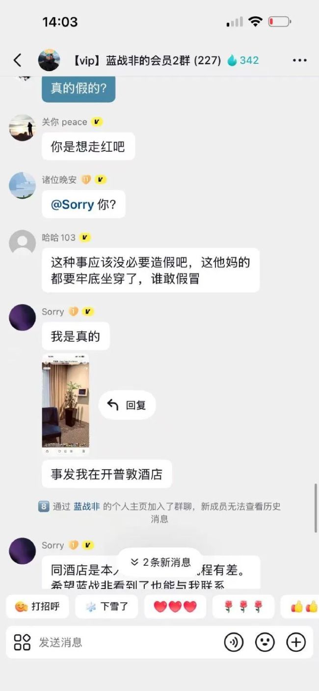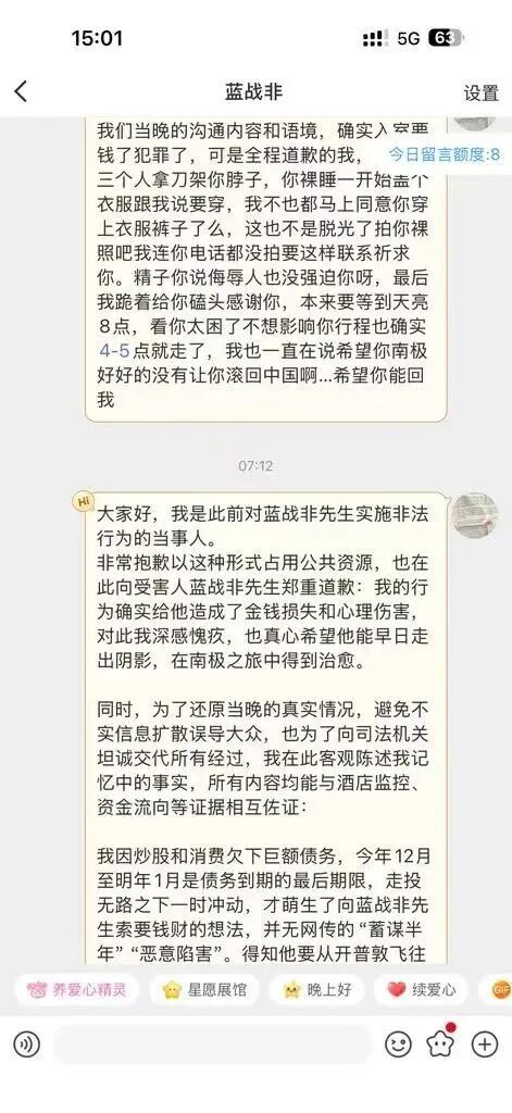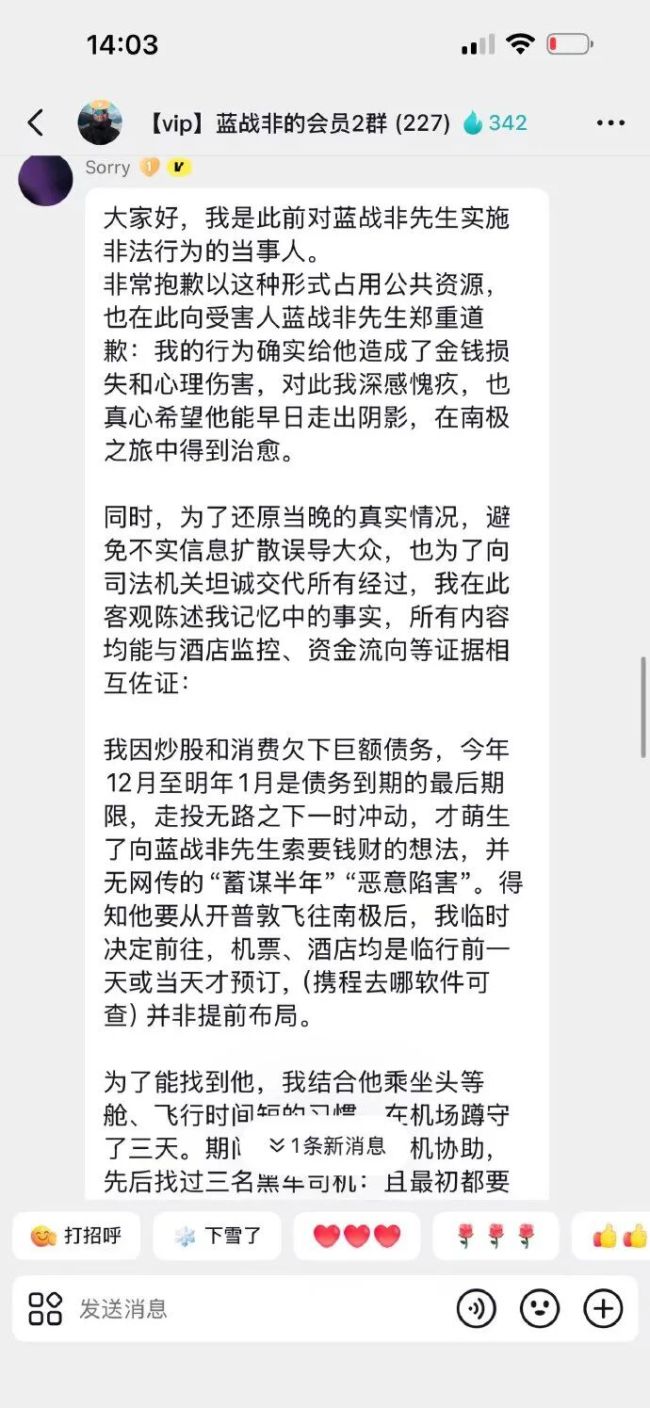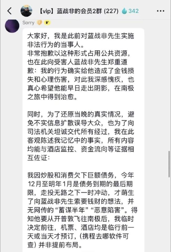 非常抱歉以这种形式占用公共资源也在此向受害人蓝战非先生郑重道歉:我的行为确实给他造成了金钱损失和心理伤害,对此我深感愧疚,也真心希望他能早日走出阴影,在南极之旅中得到治愈。 同时,为了还原当晚的真实情况,避免不实信息扩散误导大众,也为了向司法机关坦诚交代所有经过,我在此客观陈述我记忆中的事实,所有内容均能与酒店监控、资金流向等证据相互佐证: 我因炒股和消费欠下巨额债务,今年12月至明年1月是债务到期的最后期限,走投无路之下一时冲动,才萌生了向蓝战非先生索要钱财的想法,并无网传的“蓄谋半年”“恶意陷害”。得知他要从开普敦飞往南极后,我临时决定前往,机票、酒店均是临行前-天或当天才预订,(携程去哪软件可查)并非提前布局。